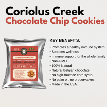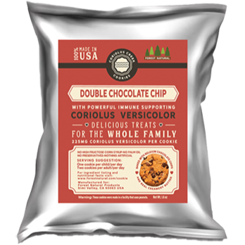 Coriolus Creek Cookies are a daily dietary supplement for the whole family made with the Coriolus versicolor mushroom to help support the body's immune system. These cookies are all-natural and free of hydrogenated oils, trans fats, high-fructose corn syrup, palm oil, preservatives and contain no artificial ingredients. They are lower in sugar than most cookies because they don't require over saturated sweetness to mask lower quality ingredients. They also include a proprietary strain of the Coriolus versicolor mushroom and offer the best value for the money. It is a combination of both Polysaccharide Krestin (PSK) and Polysaccharide Peptide (PSP). The Coriolus versicolor mushroom offers much needed immune support and it can be taken on a daily basis.